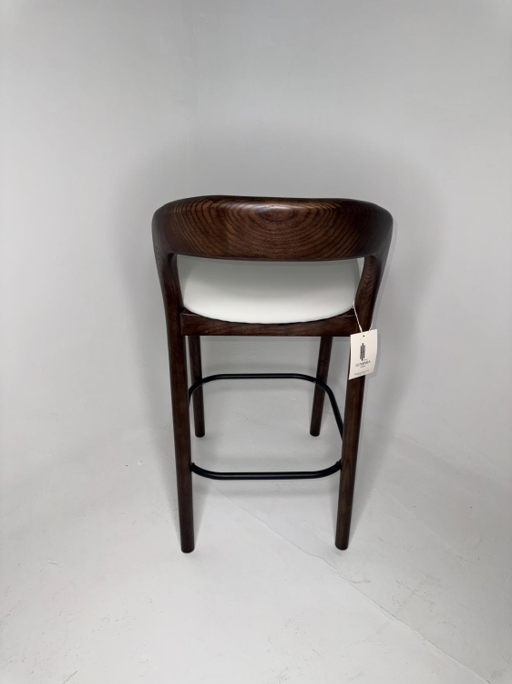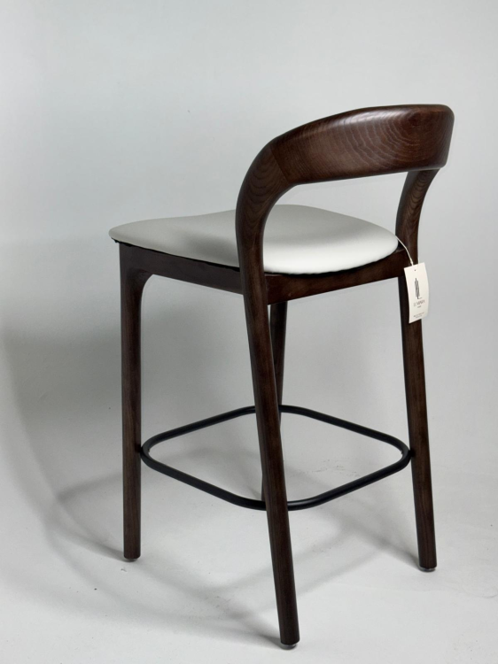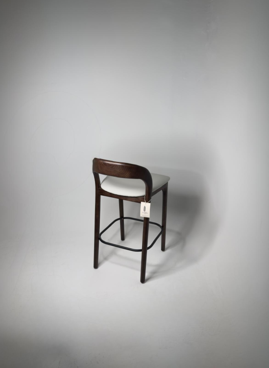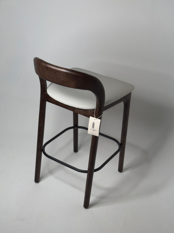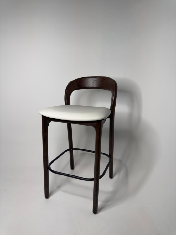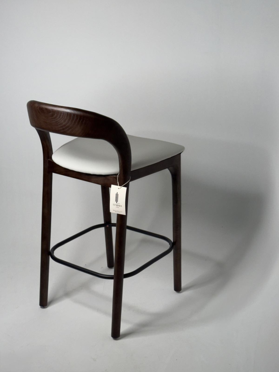 כיסא בר יוקרתי בעבודת גימור מדויקת, המשלב מבנה עץ מלא איכותי עם מושב מרופד בדמוי עור קל לניקוי.