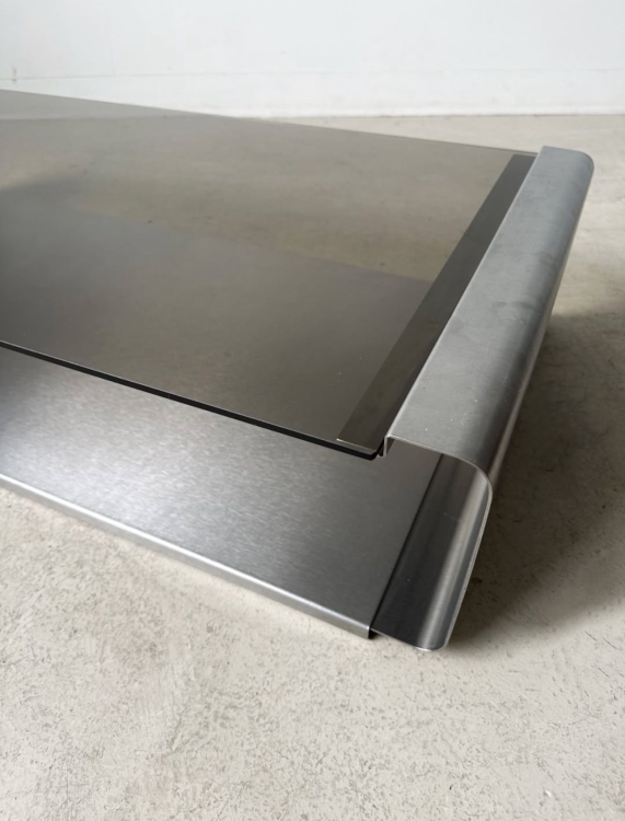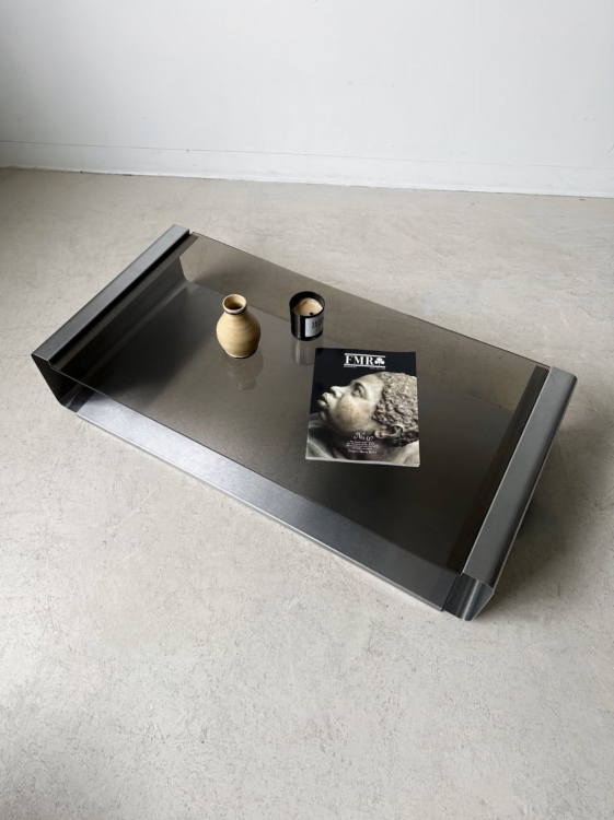 שולחן סלון בעיצוב מודרני ומדויק, המשלב גוף נירוסטה מבריקה עם משטח זכוכית מושחרת. השילוב בין מתכת יוקרתית לבין זכוכית כהה מעניק לשולחן מראה אלגנטי, מתוחכם ובעל נוכחות עיצובית בולטת.