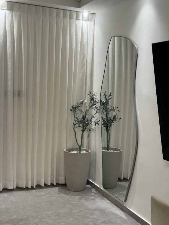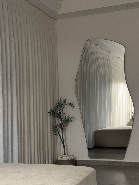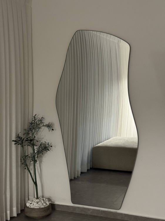 מראת Kylie בעיצוב אמורפי ייחודי, עם גב MDF איכותי שמסתיר שקעים בצורה אלגנטית.
