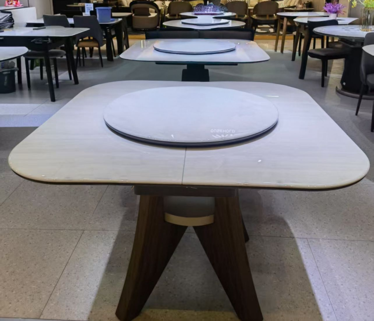 במרכז השולחן נמצא עיגול מסתובב (Lazy Susan) עשוי שיש – פריט עיצובי ושימושי המאפשר להניח עליו אוכל ולהגיע אליו מכל צד בקלות ונוחות, כך שכל סועד נהנה מגישה מושלמת לשולחן.