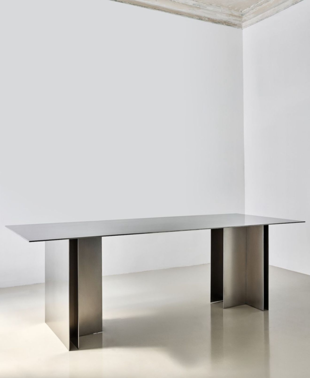 שולחן פינת אוכל בעיצוב מודרני ונקי, עשוי נירוסטה מוברשת בגימור יוקרתי ושקט. משטח דק ואלגנטי יחד עם רגליים גאומטריות יוצר שילוב נדיר של מינימליזם עכשווי ונוכחות מרשימה.