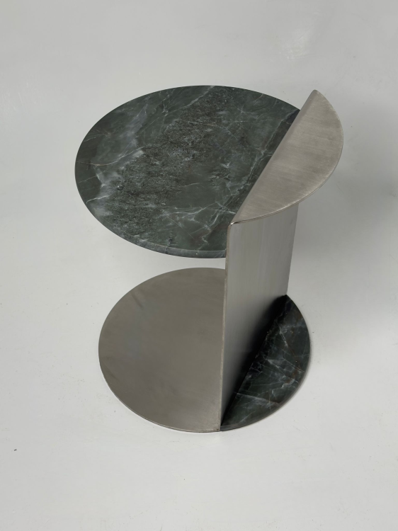 שולחן הצד דגם – LEON הוא יצירת אמנות מודרנית המשלבת בין נירוסטה מוברשת קלאסית לבין שיש טבעי בגוון ירוק כהה עמוק, בעל טקסטורה מרהיבה וורידים דקים בגווני אפור-לבן. השילוב בין החומרים יוצר פריט מעוצב, מרשים ונוכח – כזה שמעלה את הרמה האסתטית של כל חלל.